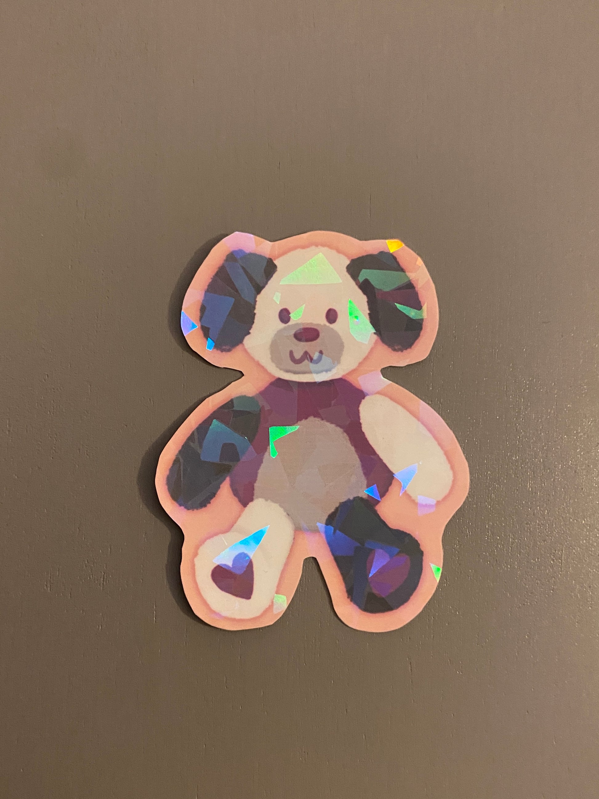 Glossy holographic sticker of a teddy bear with the asexual pride flag colours